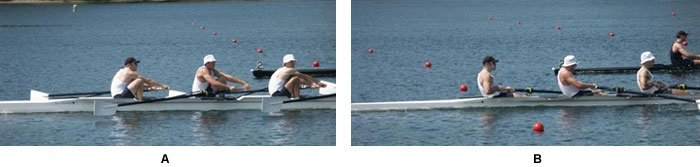 In photo A, Cal, in lane 2, is about to cross the finish line