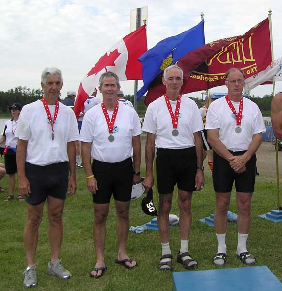KMRC Silver Medal F4- (Four without coxswain, age 60+). Left to Right: Tony Johnson, Pat Hayes, Dick Lyon, Larry Hough (click on photo for larger image)