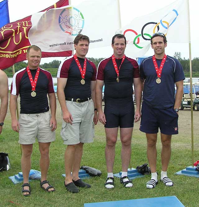 This crew of Sean Gorvy, Neil West, Matt Parish and James Baker, with cox Andrew Probert, led the Russians and Marin Rowing Association for the first third of the race, but lost the lead to both who placed first and second, resulting in the bronze medal for the KMRC crew, rowing under their UK Club, Crabtree Rowing Club.